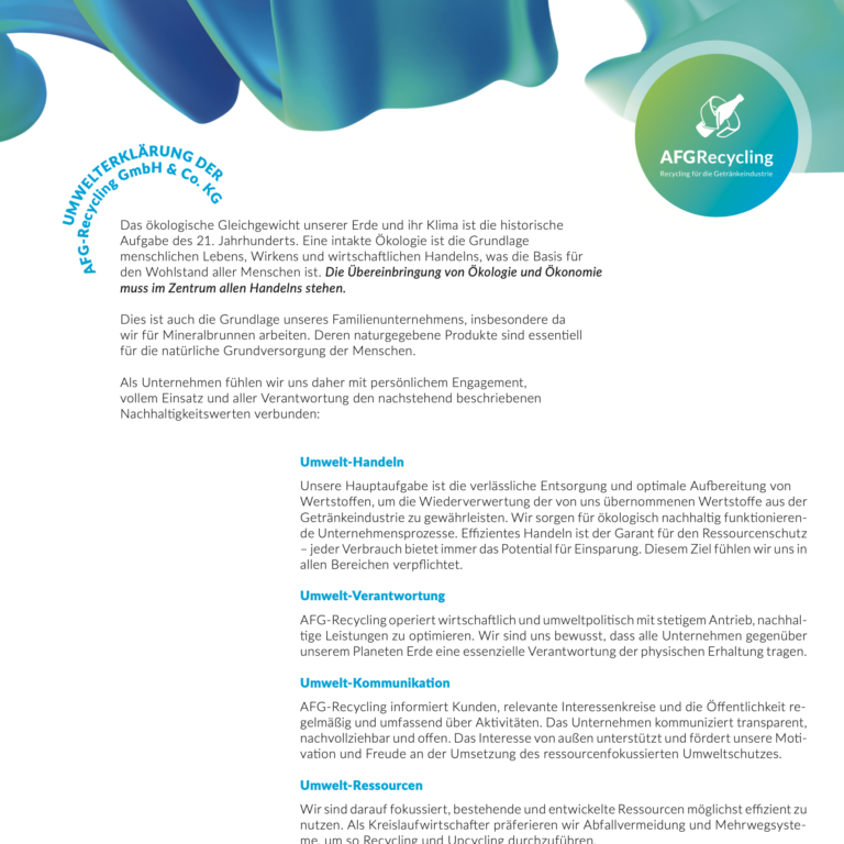 AFG-Recycling ist seit mehr als 40 Jahren und in der dritten Generation als inhabergeführtes Familienunternehmen Partner der Getränkeindustrie. Heute gehören wir zu den Marktführern in Deutschland und sind stolz darauf, die größten und namhaftesten Mineralbrunnen und Getränkehersteller in Deutschland zu unseren Kunden zählen zu dürfen.