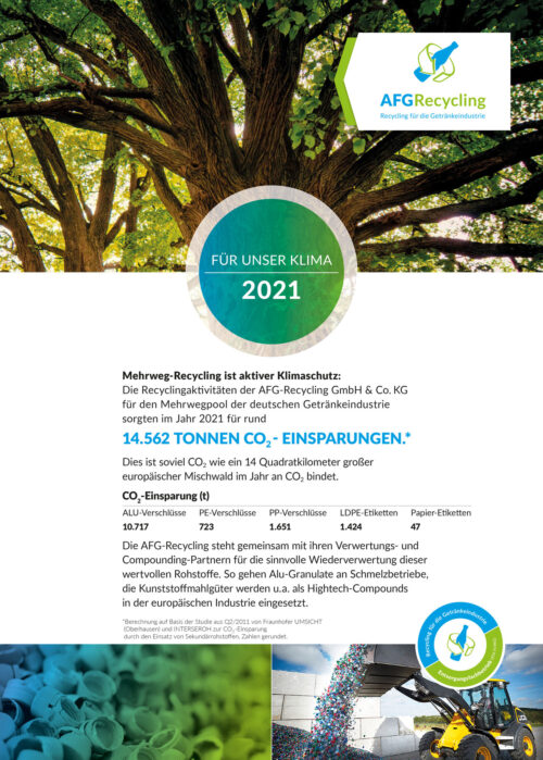 Die CO2-Bilanz 2021 der AFG-Recycling bestätigt die nachhaltige und erfolgreiche Weiterverarbeitung von z.B. recyclingfähigen Alt-Verschlüssen und LDPE-Folien-Etiketten von Getränkeflaschen. Im Verlauf des Jahres 2021 konnten Einsparungen in Höhe von rund 15.000 Tonnen CO2 erzeugt werden.