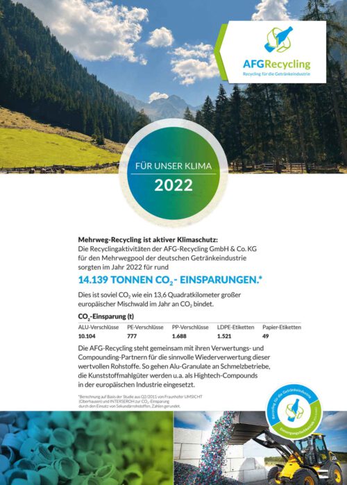 Auch im Jahr 2022 hat die AFG-Recycling durch die Weiterverarbeitung von zum Beispiel recyclingfähigen Alt-Verschlüssen und LDPE-Folien-Etiketten von Getränkeflaschen beachtliche Einsparungen in Höhe von rund 14.000 Tonnen CO2 erzielt. Dies entspricht einer Summe, die ein 13,6 Quadratkilometer großer europäischer Mischwald an CO2 bindet.