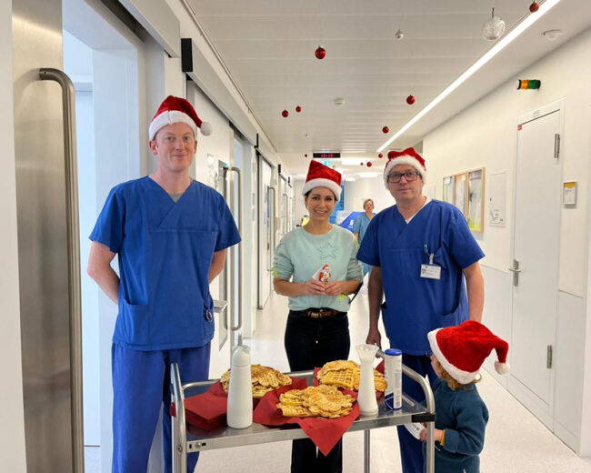 Mit einem Wagen voller duftender, frischer Waffeln, Schokonikoläusen und großen Kannen Kaffee besuchte das Team mit Anja Stevens als Vorsitzende des Fördervereins der Kinderklinik alle Patientenzimmer der drei Intensivstationen sowie die Geburtsstation